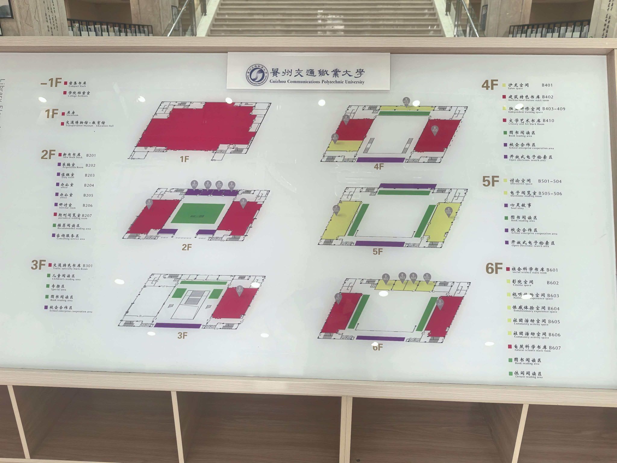 6、六楼设有社科书库(政治、经济、军事、教育、语言)、科技书库(工业、计算机、数学、化学、物理)、视听室、社团活动室。