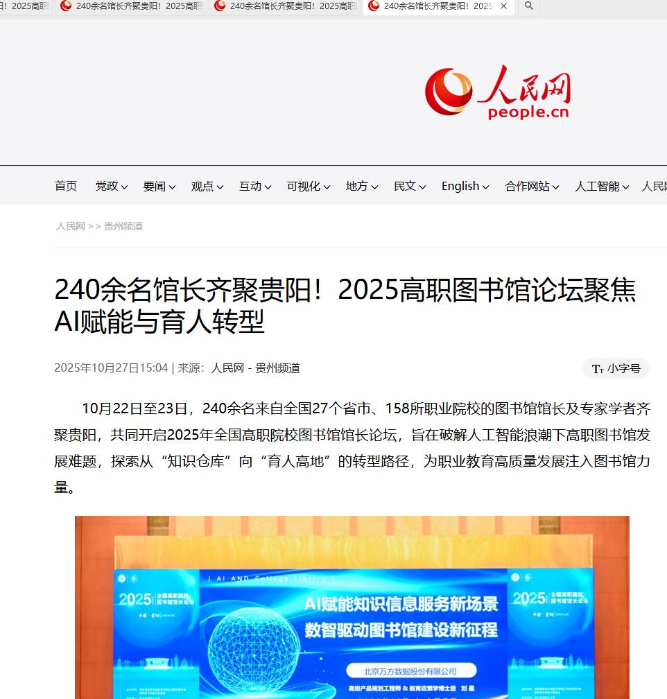 10月22日至23日,240余名来自全国27个省市、158所职业院校的图书馆馆长及专家学者齐聚贵阳,共同开启2025年全国高职院校图书馆馆长论坛,旨在破解人工智能浪潮下高职图书馆发展难题,探索从“知识仓库”向“育人高地”的转型路径,为职业教育高质量发展注入图书馆力量。