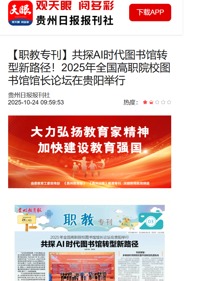 “近年来智能检索、个性化服务正在成为读者的新期待。如何推动高职院校图书馆实现从‘知识仓库’向‘育人高地’的转型升级?”10月22日,2025年全国高职院校图书馆馆长论坛在贵阳举行,来自全国27个省市、158所职业院校的240余名馆长馆员及图书馆界的专家学者,围绕人工智能浪潮与职业教育高质量发展双轮驱动下高职院校图书馆转型命题,展开了一场思想碰撞。